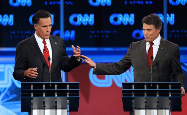 There is nothing like a good heavyweight fight live from Las Vegas. The only thing missing from last night’s rock ’em sock ’em Republican Presidential Primary Debate was the heavyweights (all of whom have decided against running). Last night’s debate was the eighth Republican Presidential debate in this campaign and was the liveliest so far with the candidates screaming at each other like the Real Housewives of New York City. After eight debates with still three months to go before the first primary, the Republicans are going to have to get creative about their debate formats to keep viewers interested. Perhaps adding Ryan Seacrest as the moderator with Simon Cowell offering immediate feedback would help. Or they could add a performance night like America’s Got Talent so we could hear Herman Cain sing Imagine There’s No Pizza. Or they could have all the candidates live together in a Big Brother house so we could see how long it takes Mitt Romney to put on his make up in the morning and we could watch everyone mix up their blue suits and red ties. Or they could send them all out in the jungle for a week without food and water and see if they eat Newt Gingrich. Or maybe one week they could each come up with a plan to cut spending in the Kardashian household. Or maybe we could just start voting now by telephone or text message and start eliminating one each week.